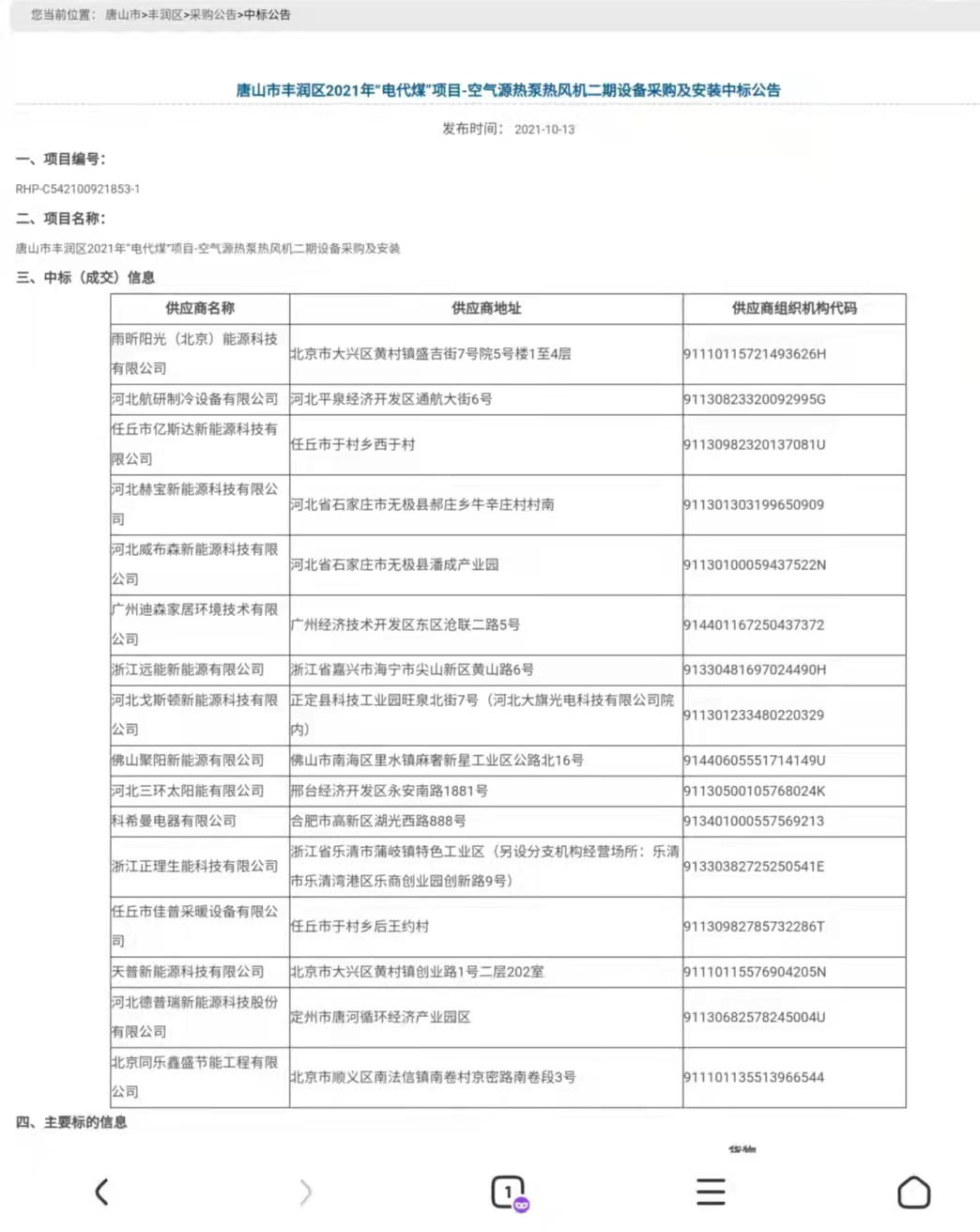 雨昕陽光中標唐山豐潤區電代煤項目-空氣源熱泵熱風機采購項目