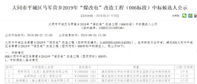 近幾年,越來越多的地區開展了煤改清潔能源行動,近日,山西省大同市平城區馬軍營鄉2019年“煤改電”改造工程開標,雨昕陽光再次成功中標。這是雨昕陽光公司近幾年相繼中標北京、天津、河北、山東等省份煤改電項目后,再次中標山西省煤改電項目,該項目類型為分散蓄熱式電采暖器系統,公司已做好充分準備,將全力以赴為山西“煤改電”項目貢獻自己的一份力量,為廣大民眾帶去了溫暖舒適的冬季采暖服務。