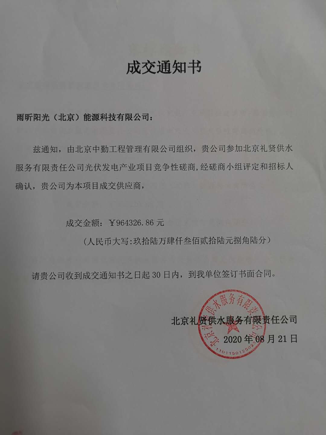 祝賀雨昕陽光中標大興區禮賢供水服務公司光伏發電項目