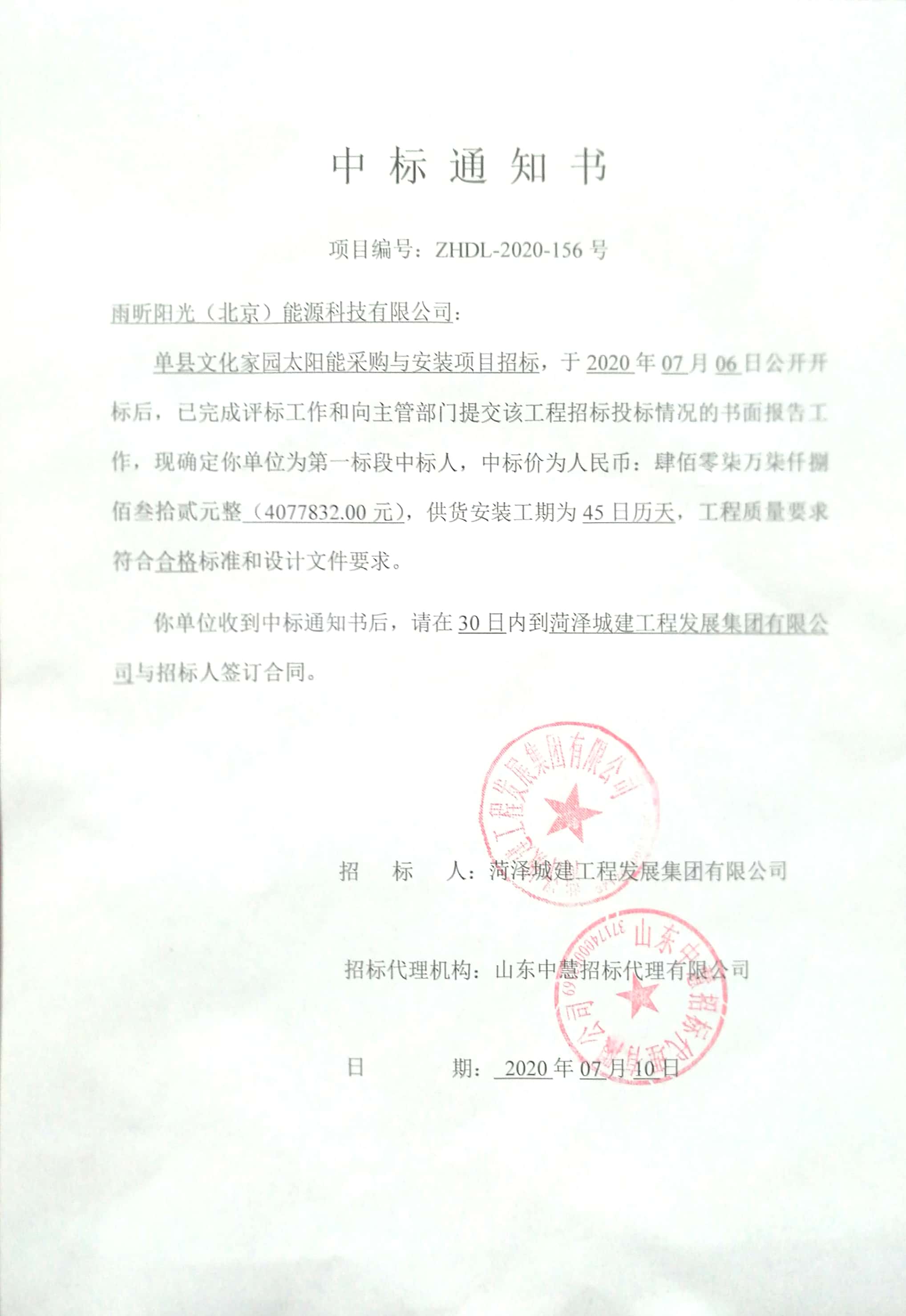 祝賀雨昕陽光中標單縣文化家園太陽能熱水項目