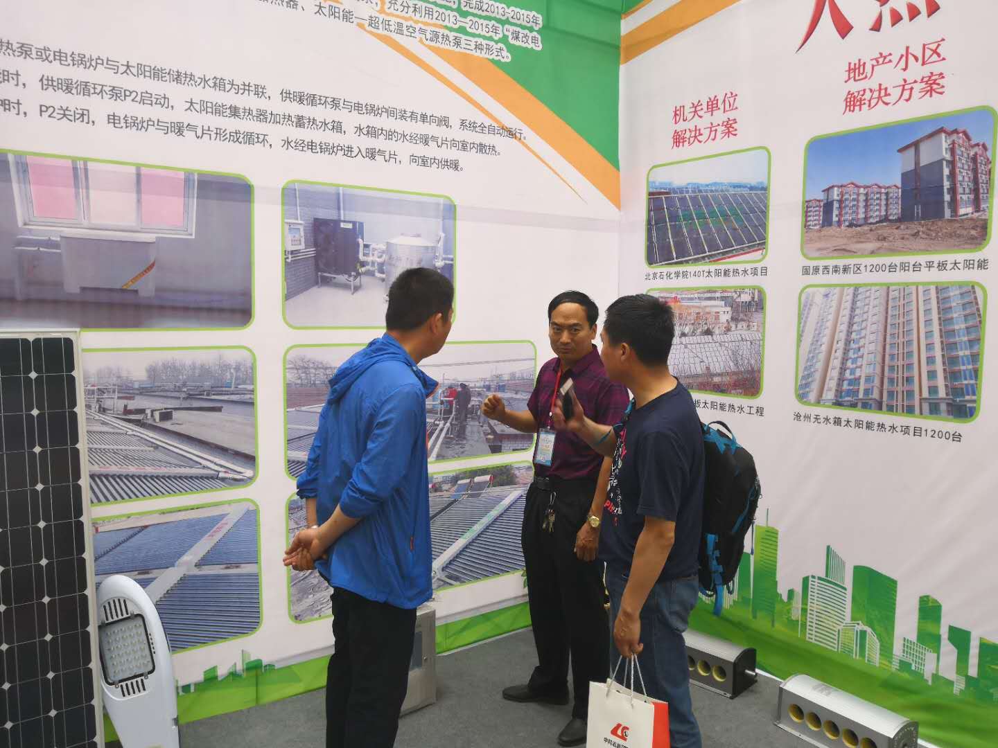 雨昕陽光公司與會參展,現場展示了公司太陽能熱水、空氣源熱泵、分布式光伏發電等煤改清潔能源取暖相關的最新產品和工程案例,受到了熱烈關注。作為京津冀地區“煤改電”項目的中標供應商,公司已經做好了準備,將全力以赴為甘肅“煤改電”項目貢獻自己的一份力量。
