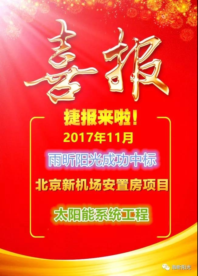 2017年11月,雨昕陽光中標北京新機場安置房項目太陽能系統工程,總合同額約1600余萬元,項目共計兩個標段:北京新機場安置房項目(禮賢組團)1標段(0107地塊)太陽能系統工程項目和北京新機場安置房項目(禮賢組團)2標段(0110、0111地塊)太陽能系統工程項目。